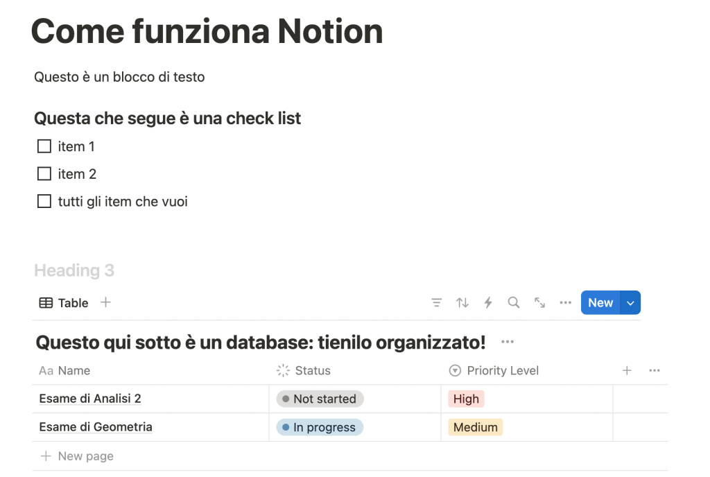 Il tuo spazio di lavoro in Notion è organizzato in pagine. Ogni pagina può contenere testo, immagini, link, database o altre pagine, permettendoti di creare una gerarchia di informazioni.